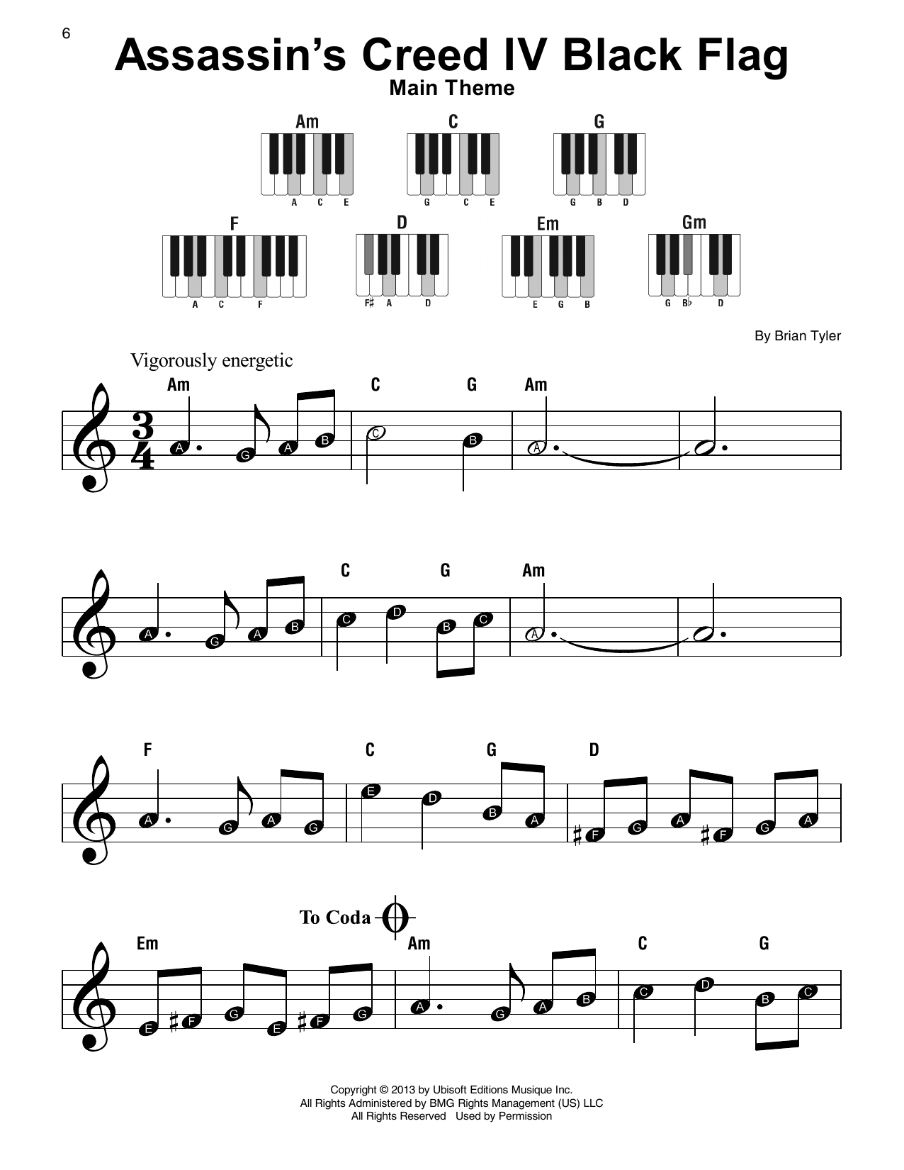 Download or print Brian Tyler Assassin's Creed IV Black Flag (Main Theme) sheet music, chords and digital score arranged for Easy Piano Solo. This Video Game score includes 3 page(s).