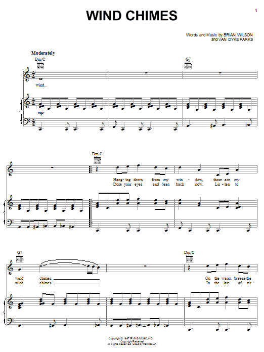 Download or print Brian Wilson Wind Chimes sheet music, chords and digital score arranged for Piano, Vocal & Guitar Chords (Right-Hand Melody). This Pop score includes 4 page(s).
