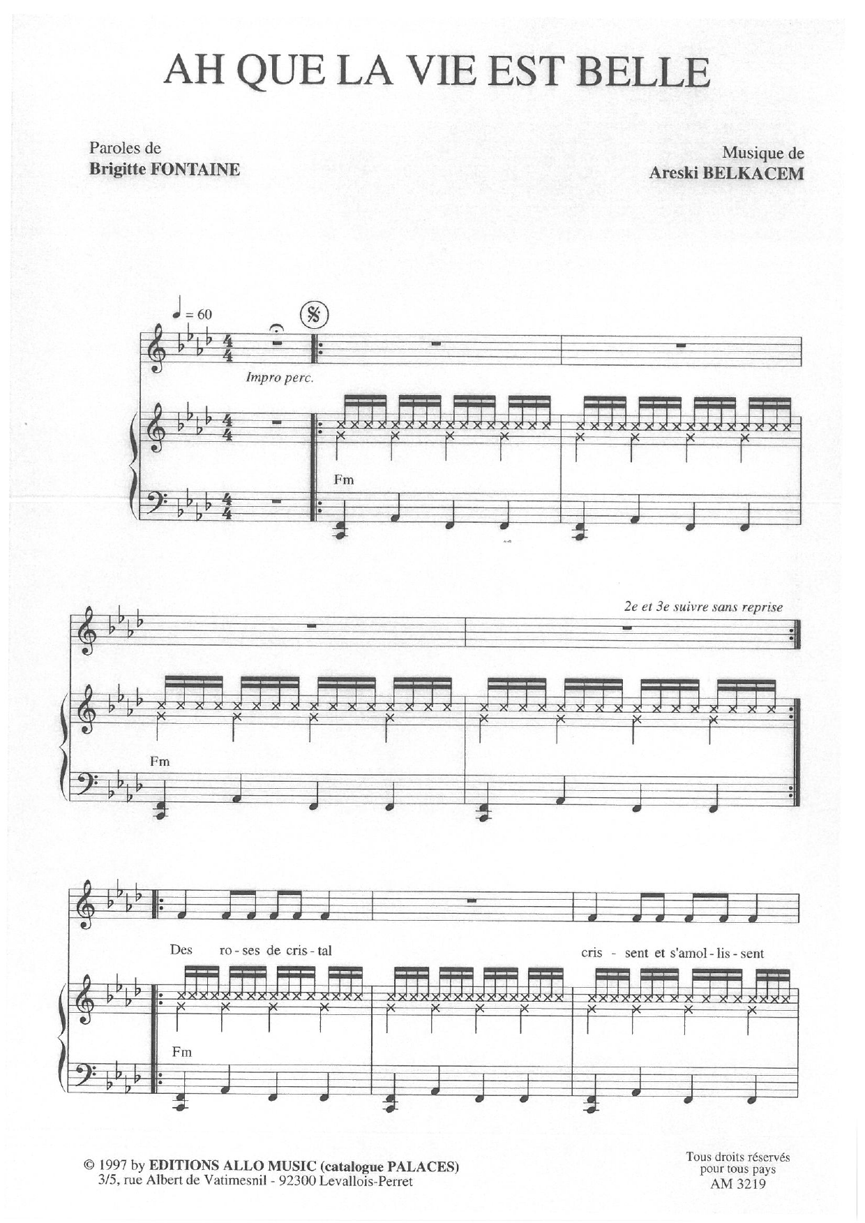 Download or print Brigitte Fontaine & Areski Belkacem Ah Que La Vie Est Belle sheet music, chords and digital score arranged for Piano & Vocal. This Classical score includes 3 page(s).