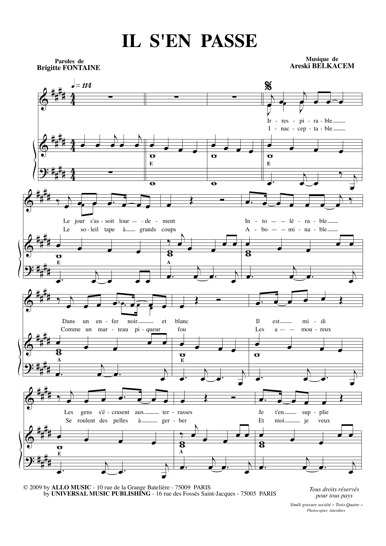 Download or print Brigitte Fontaine & Areski Belkacem Il Se Mele A Tout Ca sheet music, chords and digital score arranged for Piano & Vocal. This Classical score includes 2 page(s).