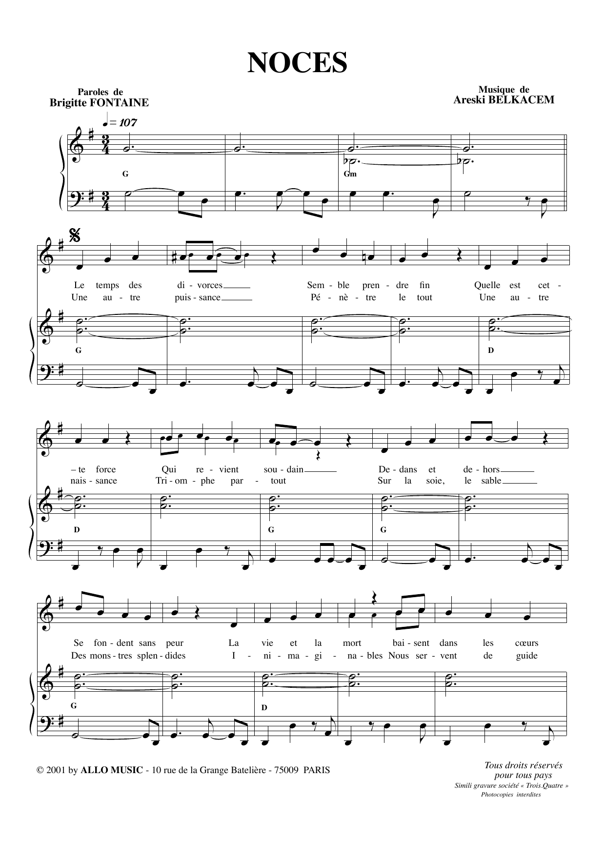 Download or print Brigitte Fontaine & Areski Belkacem Noces sheet music, chords and digital score arranged for Piano & Vocal. This Classical score includes 3 page(s).
