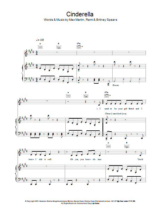Download or print Britney Spears Cinderella sheet music, chords and digital score arranged for Piano, Vocal & Guitar Chords. This Pop score includes 6 page(s).