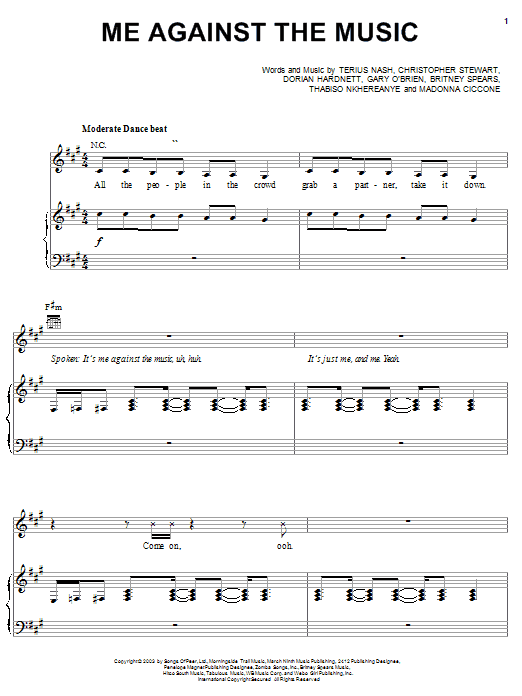 Download or print Britney Spears Me Against The Music sheet music, chords and digital score arranged for Lead Sheet / Fake Book. This Pop score includes 3 page(s).