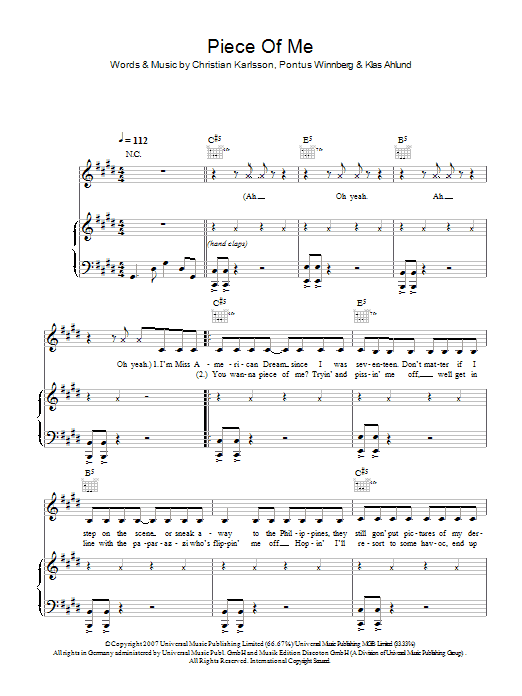Download or print Britney Spears Piece Of Me sheet music, chords and digital score arranged for Piano, Vocal & Guitar Chords (Right-Hand Melody). This Pop score includes 6 page(s).