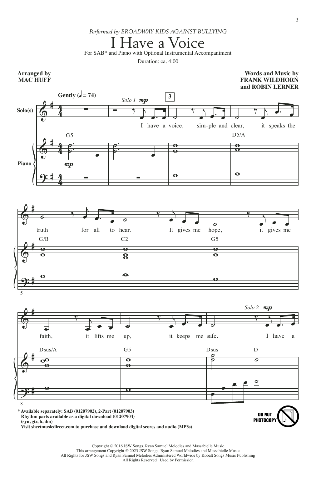 Download or print Broadway Kids Against Bullying I Have A Voice (arr. Mac Huff) sheet music, chords and digital score arranged for SAB Choir. This Inspirational score includes 9 page(s).