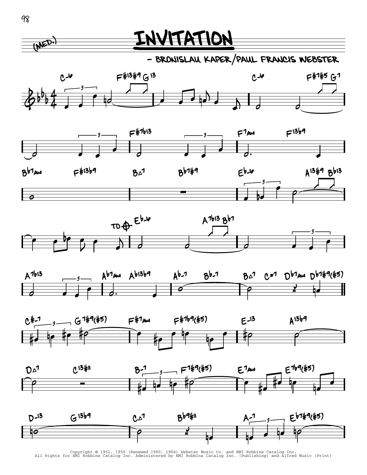 Download or print Bronislau Kaper Invitation (arr. David Hazeltine) sheet music, chords and digital score arranged for Real Book – Enhanced Chords. This Jazz score includes 2 page(s).