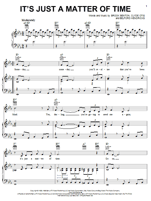 Download or print Brook Benton It's Just A Matter Of Time sheet music, chords and digital score arranged for Piano, Vocal & Guitar Chords (Right-Hand Melody). This Blues score includes 3 page(s).