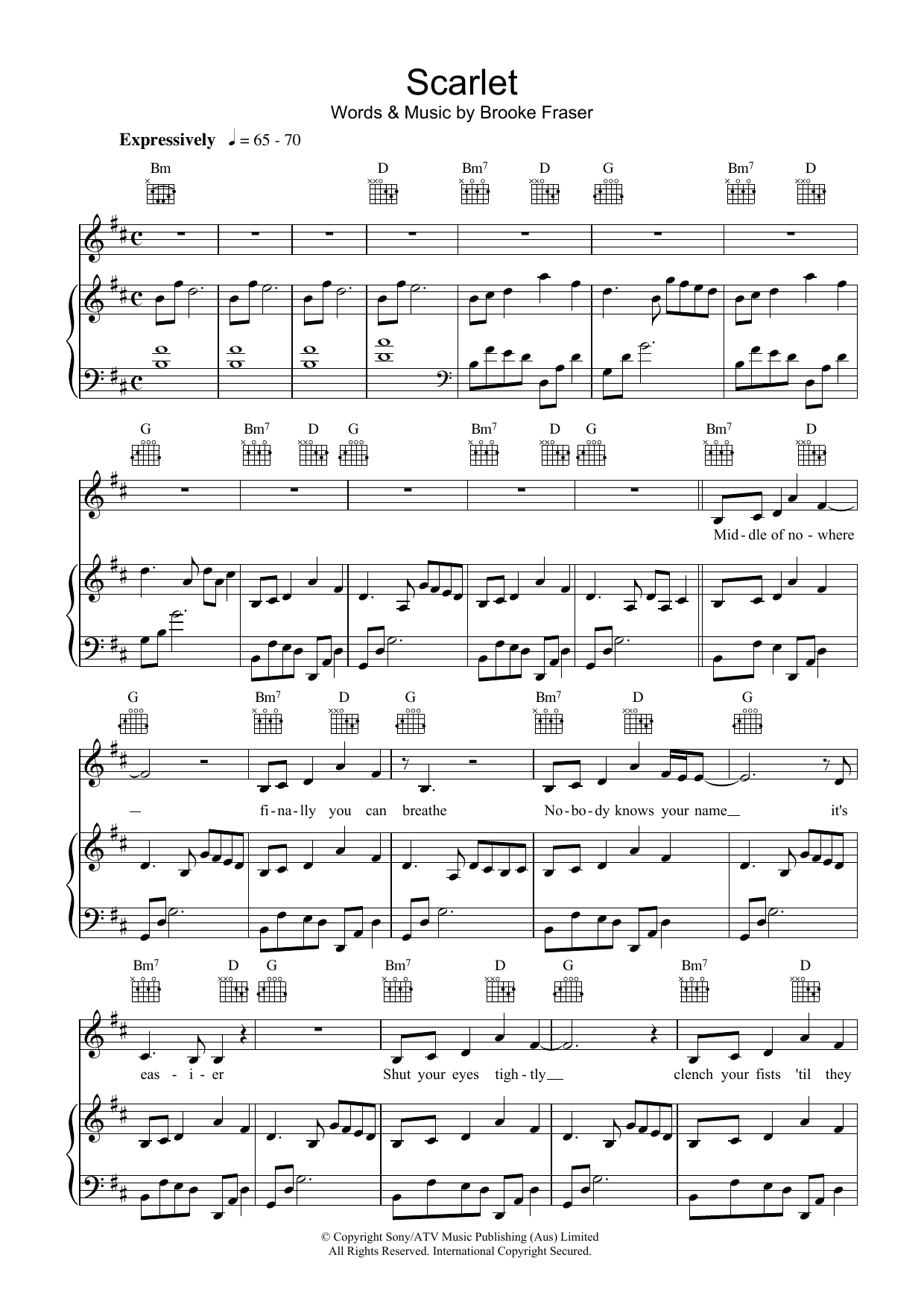 Download or print Brooke Fraser Scarlet sheet music, chords and digital score arranged for Piano, Vocal & Guitar Chords. This Pop score includes 5 page(s).