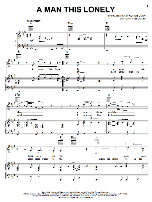 Download or print Brooks & Dunn A Man This Lonely sheet music, chords and digital score arranged for Piano, Vocal & Guitar Chords (Right-Hand Melody). This Country score includes 5 page(s).