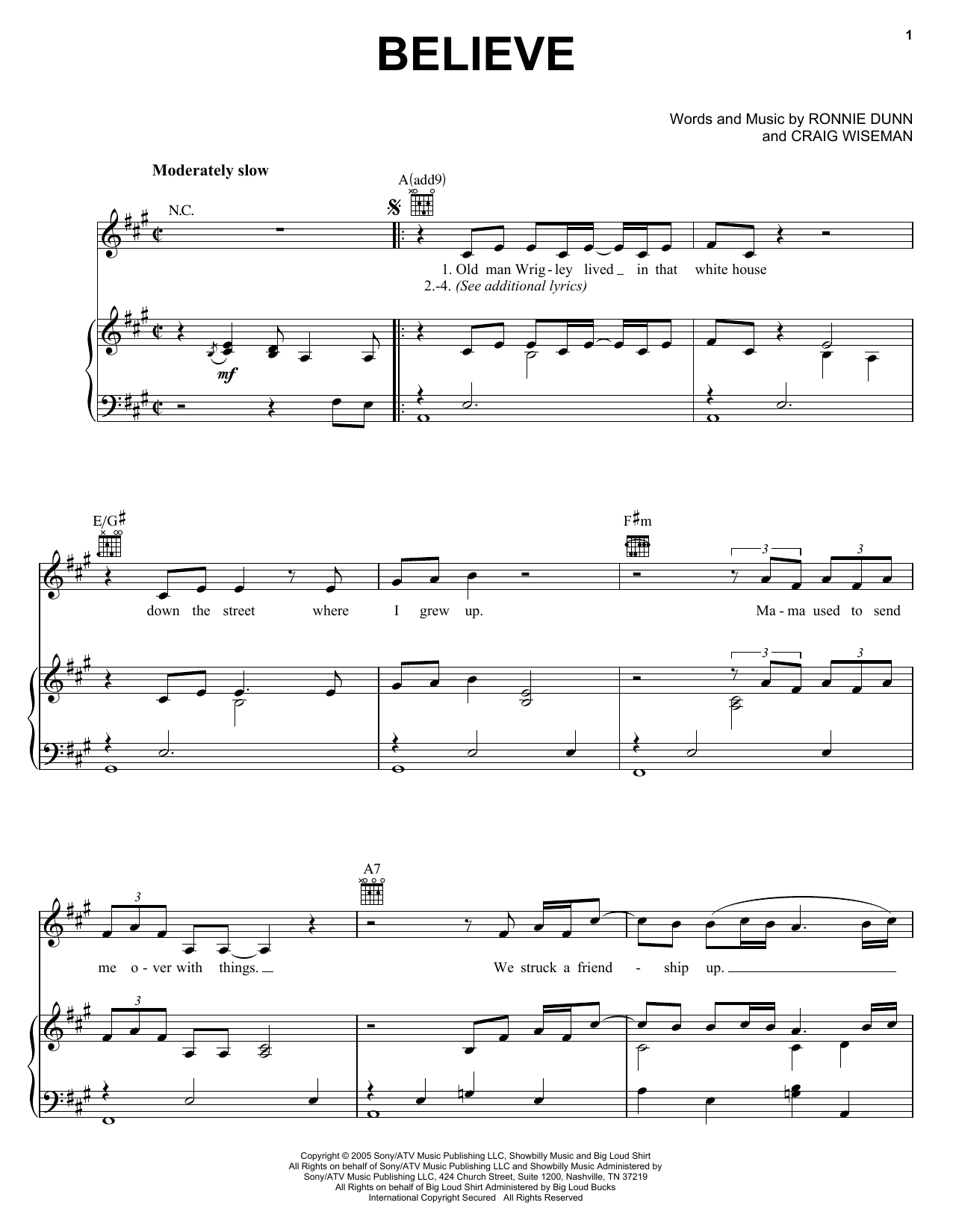 Download or print Brooks & Dunn Believe sheet music, chords and digital score arranged for Piano, Vocal & Guitar Chords (Right-Hand Melody). This Country score includes 7 page(s).