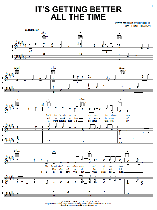 Download or print Brooks & Dunn It's Getting Better All The Time sheet music, chords and digital score arranged for Piano, Vocal & Guitar Chords (Right-Hand Melody). This Country score includes 5 page(s).