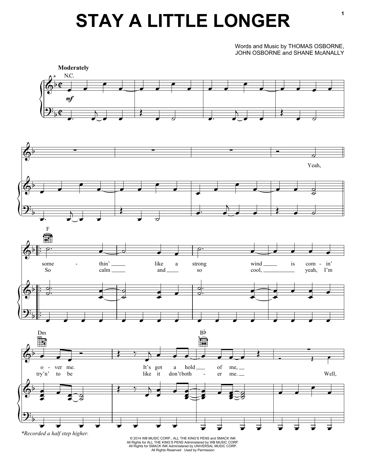 Download or print Brothers Osborne Stay A Little Longer sheet music, chords and digital score arranged for Piano, Vocal & Guitar Chords (Right-Hand Melody). This Pop score includes 7 page(s).