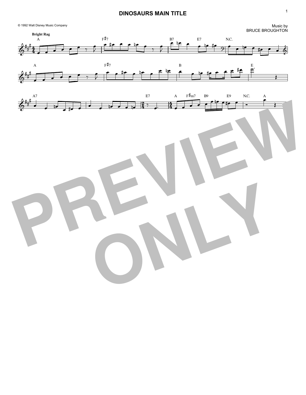 Download or print Bruce Broughton Dinosaurs Main Title sheet music, chords and digital score arranged for Lead Sheet / Fake Book. This Film/TV score includes 1 page(s).