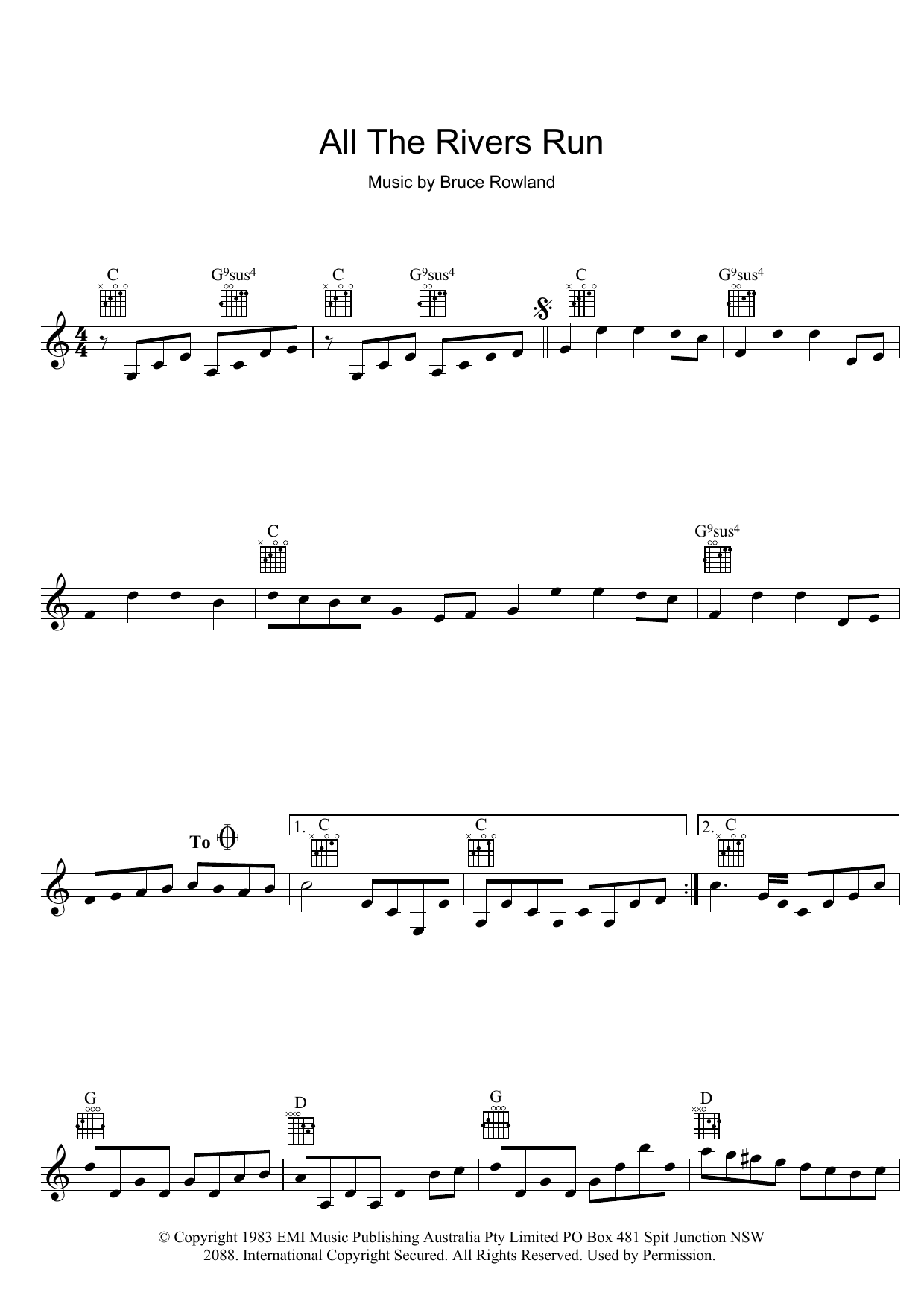 Download or print Bruce Rowland All The Rivers Run sheet music, chords and digital score arranged for Lead Sheet / Fake Book. This Film/TV score includes 2 page(s).