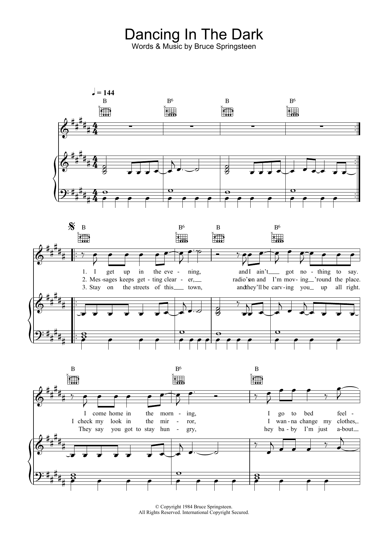 Download or print Bruce Springsteen Dancing In The Dark sheet music, chords and digital score arranged for Easy Piano. This Pop score includes 5 page(s).