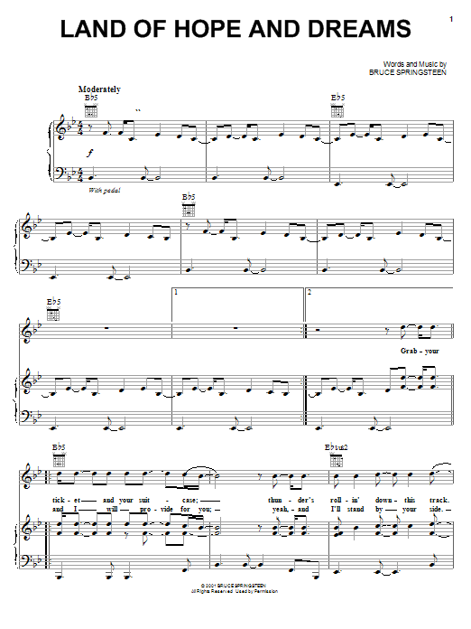 Download or print Bruce Springsteen Land Of Hope And Dreams sheet music, chords and digital score arranged for Piano, Vocal & Guitar Chords (Right-Hand Melody). This Pop score includes 8 page(s).