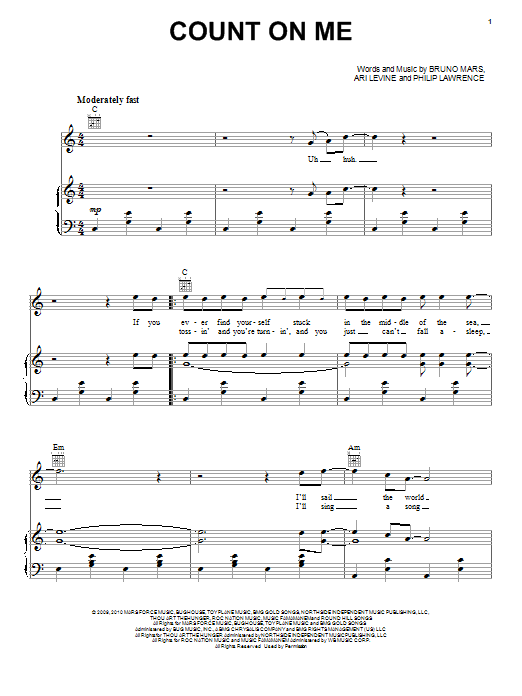 Download or print Bruno Mars Count On Me sheet music, chords and digital score arranged for Piano, Vocal & Guitar Chords (Right-Hand Melody). This Pop score includes 4 page(s).
