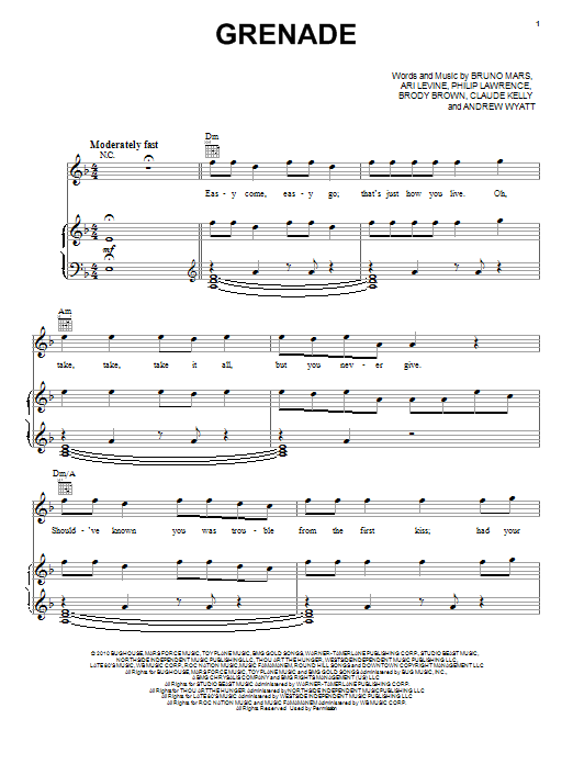 Download or print Bruno Mars Grenade sheet music, chords and digital score arranged for Piano Solo. This Pop score includes 6 page(s).