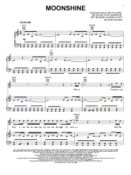 Download or print Bruno Mars Moonshine sheet music, chords and digital score arranged for Guitar Chords/Lyrics. This Rock score includes 3 page(s).