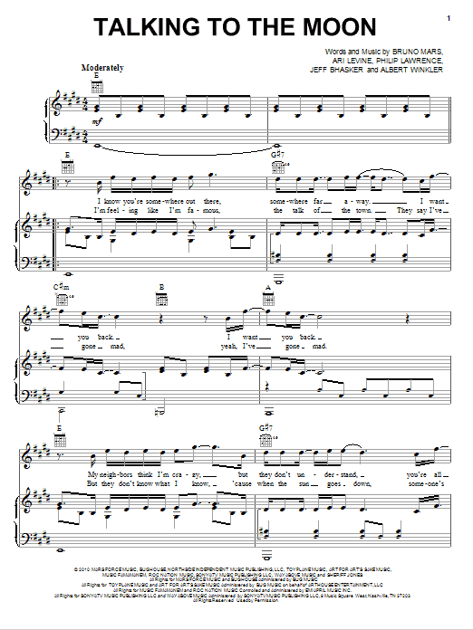 Download or print Bruno Mars Talking To The Moon sheet music, chords and digital score arranged for Guitar Chords/Lyrics. This Pop score includes 3 page(s).