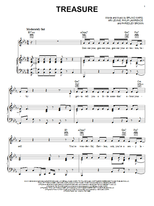 Download or print Bruno Mars Treasure sheet music, chords and digital score arranged for Easy Bass Tab. This Funk score includes 2 page(s).