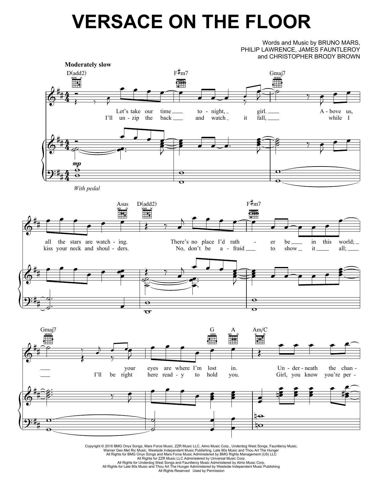 Download or print Bruno Mars Versace On The Floor sheet music, chords and digital score arranged for Super Easy Piano. This Disco score includes 2 page(s).