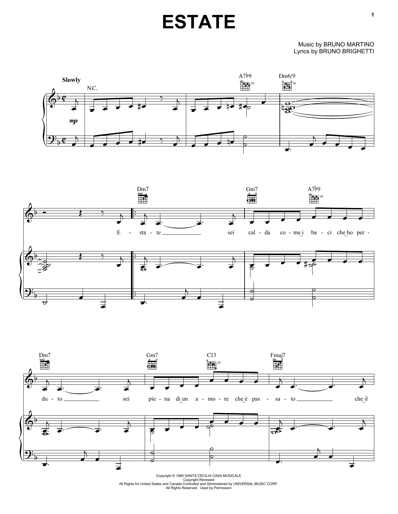 Download or print Bruno Martino Estate sheet music, chords and digital score arranged for Real Book – Melody & Chords – C Instruments. This Jazz score includes 1 page(s).