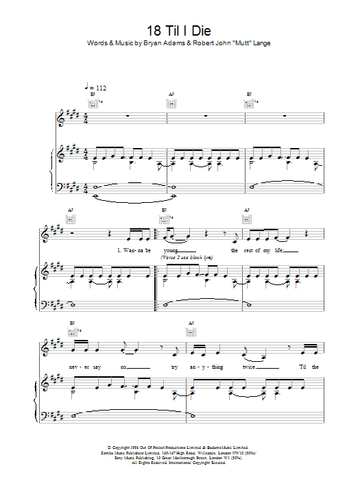 Download or print Bryan Adams 18 Til I Die sheet music, chords and digital score arranged for Piano, Vocal & Guitar Chords. This Pop score includes 6 page(s).