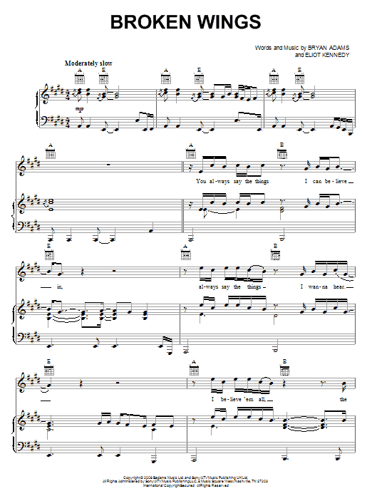 Download or print Bryan Adams Broken Wings sheet music, chords and digital score arranged for Piano, Vocal & Guitar Chords (Right-Hand Melody). This Pop score includes 6 page(s).