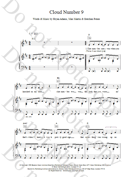 Download or print Bryan Adams Cloud Number Nine sheet music, chords and digital score arranged for Guitar Tab. This Rock score includes 8 page(s).