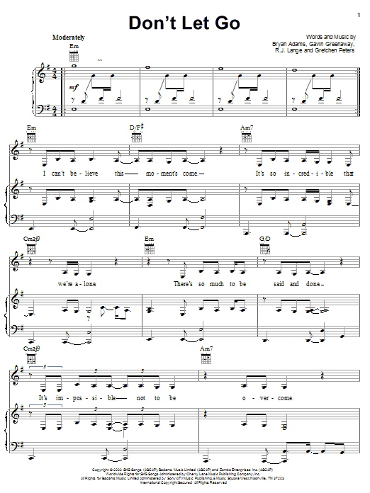 Download or print Bryan Adams Don't Let Go sheet music, chords and digital score arranged for Piano, Vocal & Guitar Chords (Right-Hand Melody). This Children score includes 7 page(s).