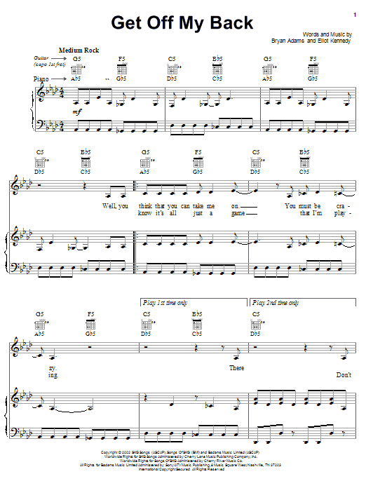 Download or print Bryan Adams Get Off My Back sheet music, chords and digital score arranged for Piano, Vocal & Guitar Chords (Right-Hand Melody). This Children score includes 6 page(s).