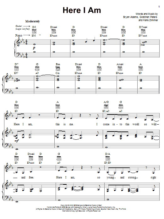 Download or print Bryan Adams Here I Am sheet music, chords and digital score arranged for Piano, Vocal & Guitar Chords (Right-Hand Melody). This Children score includes 4 page(s).