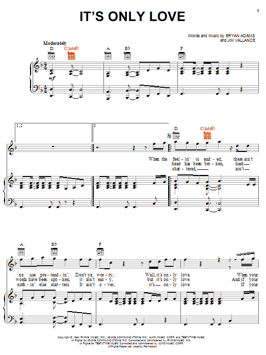 Download or print Bryan Adams It's Only Love sheet music, chords and digital score arranged for Piano, Vocal & Guitar Chords (Right-Hand Melody). This Pop score includes 4 page(s).