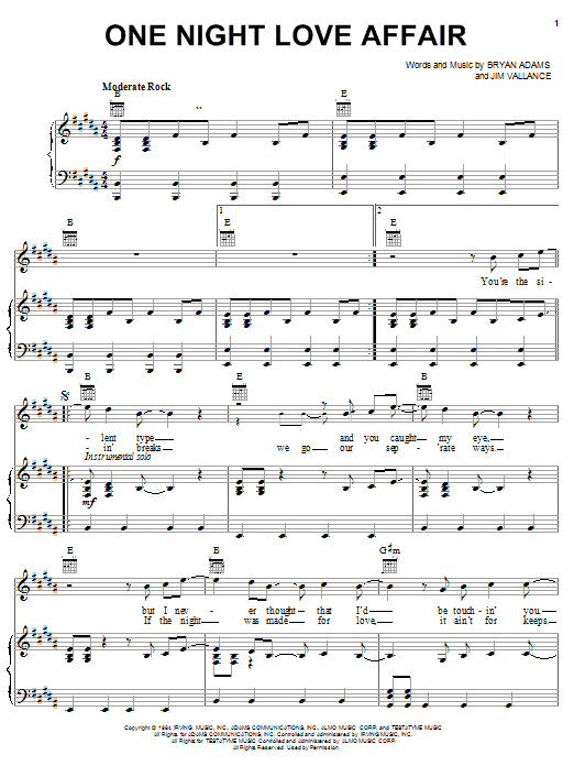 Download or print Bryan Adams One Night Love Affair sheet music, chords and digital score arranged for Piano, Vocal & Guitar Chords (Right-Hand Melody). This Pop score includes 5 page(s).