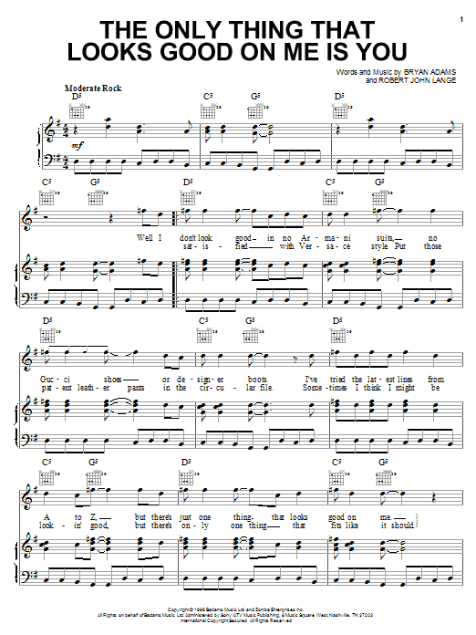 Download or print Bryan Adams The Only Thing That Looks Good On Me Is You sheet music, chords and digital score arranged for Piano, Vocal & Guitar Chords. This Pop score includes 5 page(s).