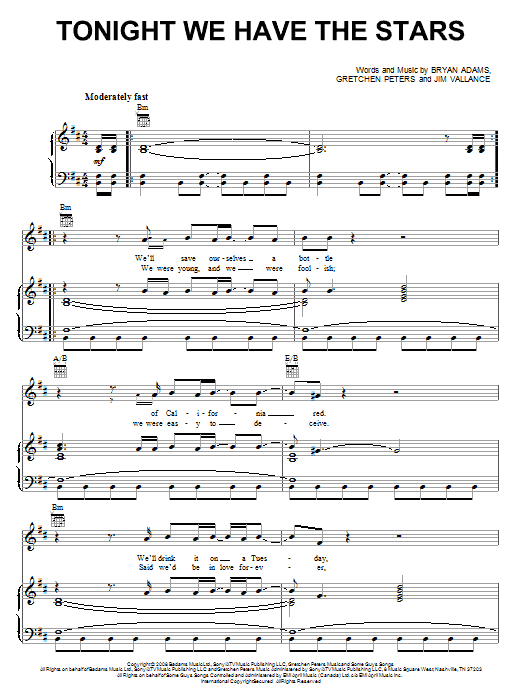 Download or print Bryan Adams Tonight We Have The Stars sheet music, chords and digital score arranged for Piano, Vocal & Guitar Chords (Right-Hand Melody). This Pop score includes 7 page(s).