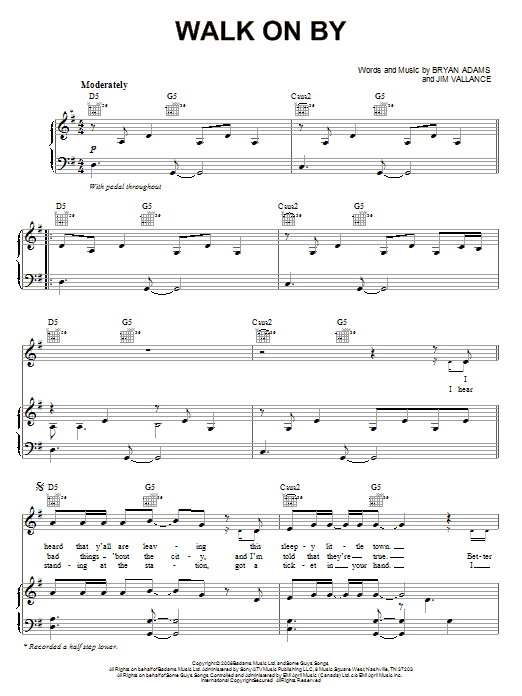 Download or print Bryan Adams Walk On By sheet music, chords and digital score arranged for Piano, Vocal & Guitar Chords (Right-Hand Melody). This Pop score includes 5 page(s).