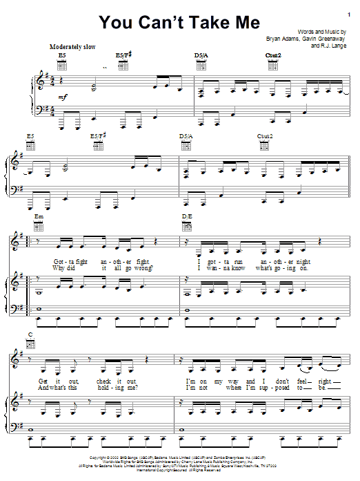Download or print Bryan Adams You Can't Take Me sheet music, chords and digital score arranged for Piano, Vocal & Guitar Chords (Right-Hand Melody). This Children score includes 4 page(s).