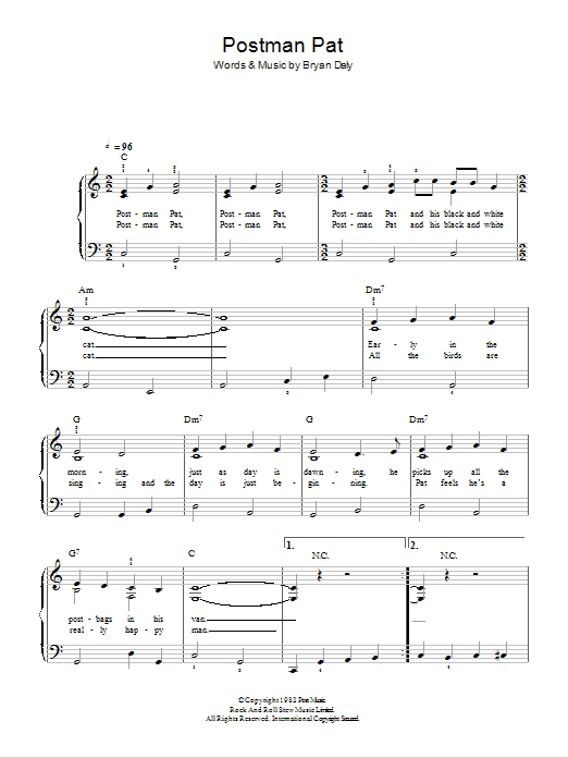 Download or print Bryan Daly Postman Pat sheet music, chords and digital score arranged for 5-Finger Piano. This Children score includes 2 page(s).