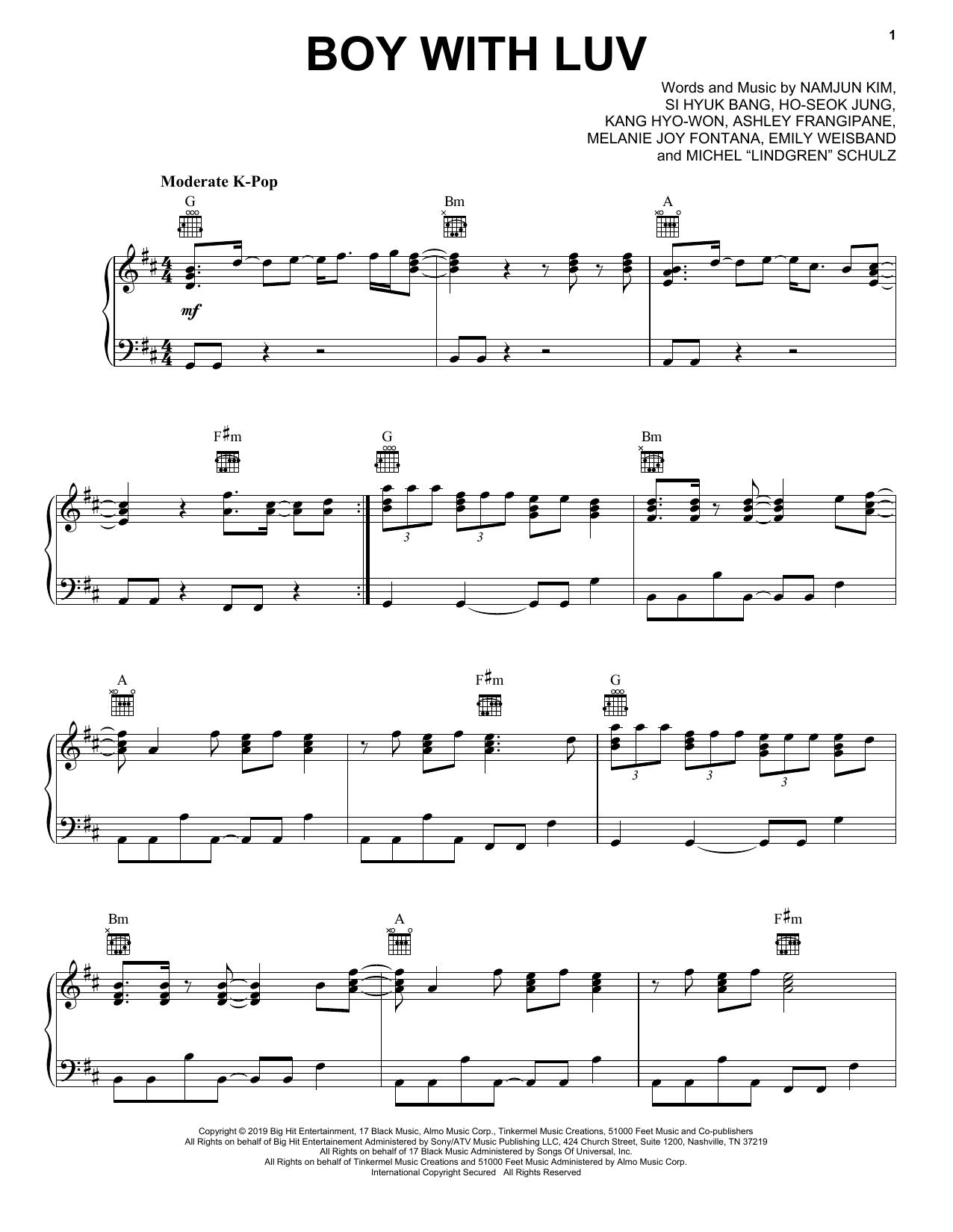 Download or print BTS Boy With Luv (feat. Halsey) sheet music, chords and digital score arranged for Piano Solo. This Pop score includes 6 page(s).