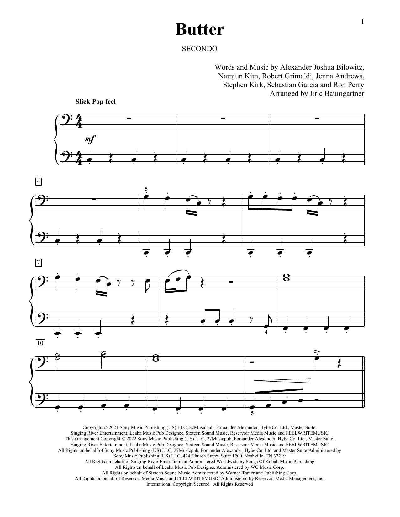 Download or print BTS Butter (arr. Eric Baumgartner) sheet music, chords and digital score arranged for Piano Duet. This Pop score includes 4 page(s).