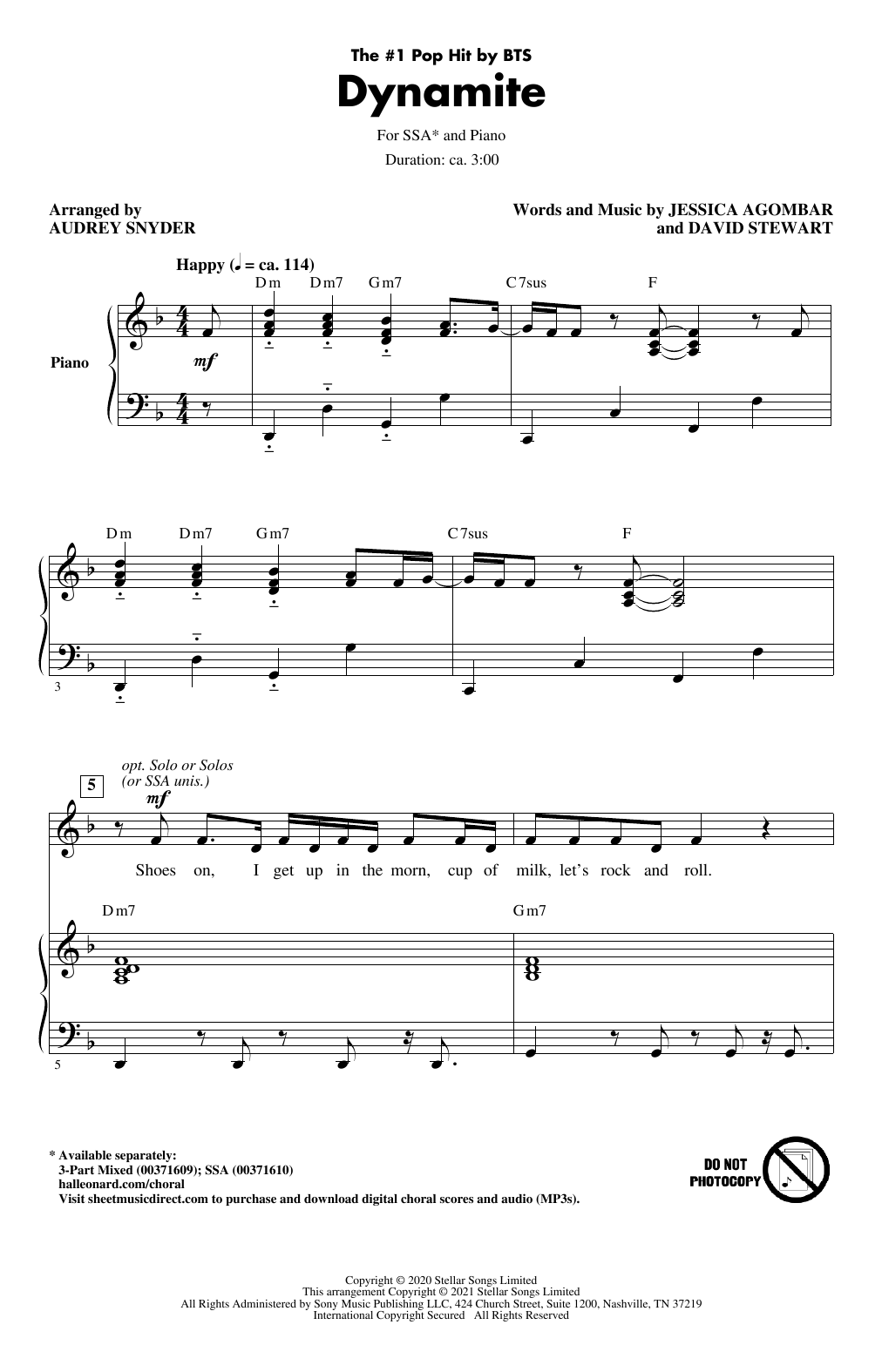 Download or print BTS Dynamite (arr. Audrey Snyder) sheet music, chords and digital score arranged for SSA Choir. This Pop score includes 13 page(s).