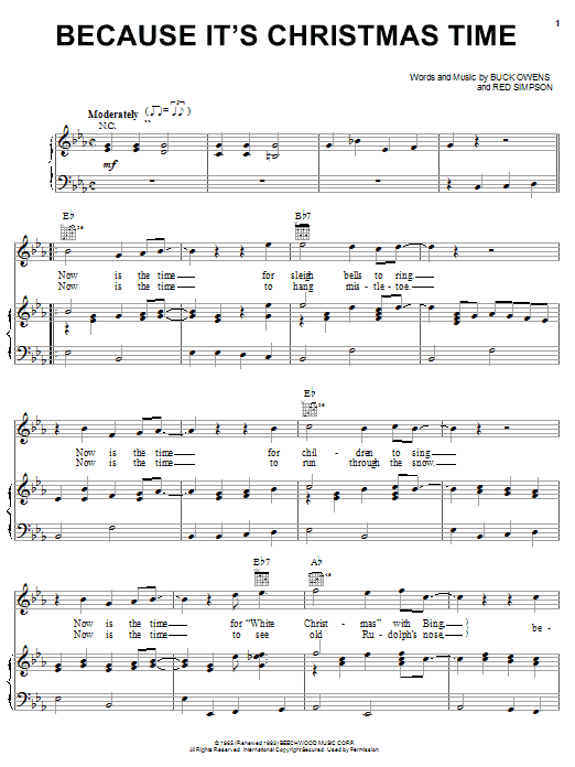Download or print Buck Owens Because It's Christmas Time sheet music, chords and digital score arranged for Piano, Vocal & Guitar Chords (Right-Hand Melody). This Christmas score includes 3 page(s).