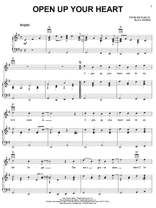 Download or print Buck Owens Open Up Your Heart sheet music, chords and digital score arranged for Piano, Vocal & Guitar Chords (Right-Hand Melody). This Country score includes 3 page(s).