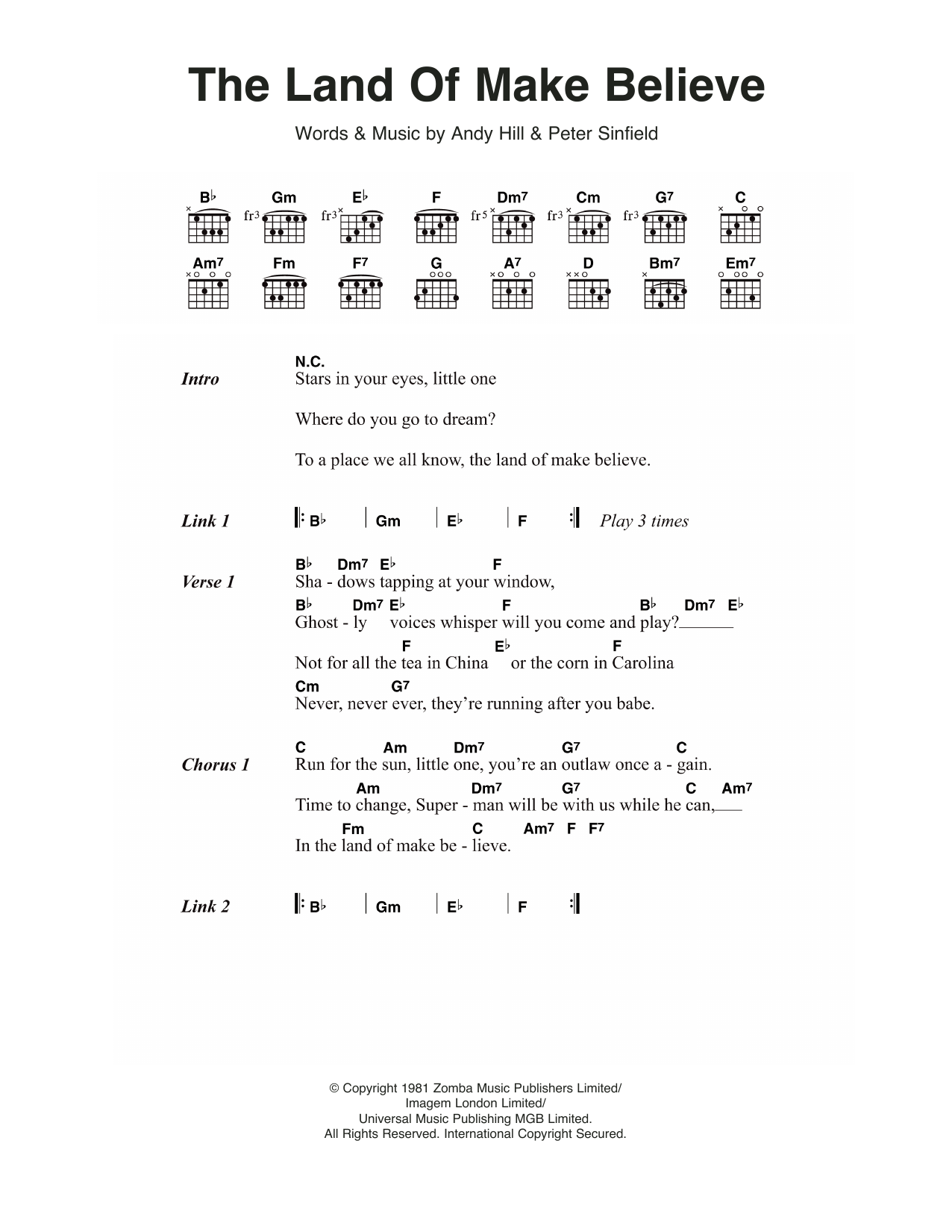 Download or print Bucks Fizz The Land Of Make Believe sheet music, chords and digital score arranged for Guitar Chords/Lyrics. This Pop score includes 3 page(s).