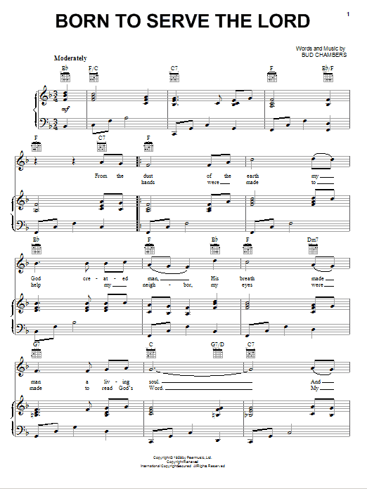 Download or print Bud Chambers Born To Serve The Lord sheet music, chords and digital score arranged for Piano, Vocal & Guitar Chords (Right-Hand Melody). This Country score includes 3 page(s).