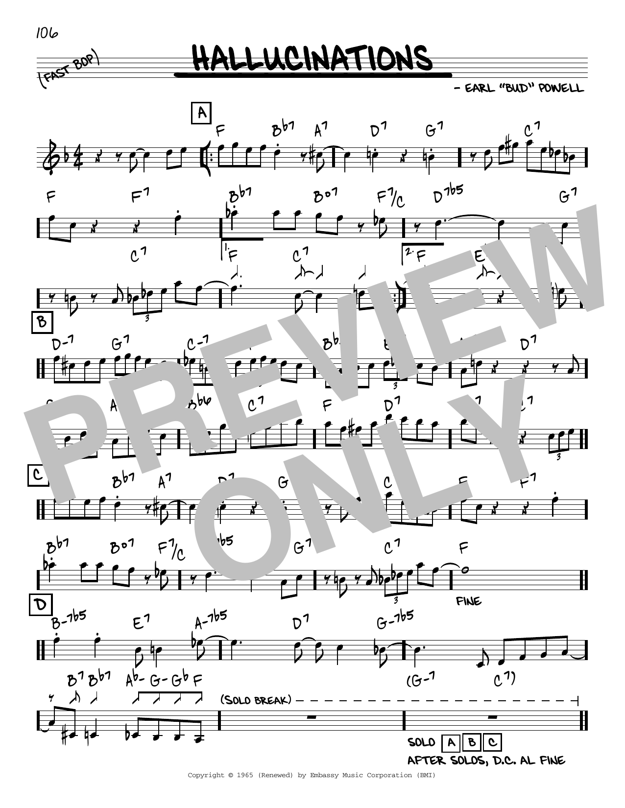 Download or print Bud Powell Hallucinations sheet music, chords and digital score arranged for Real Book – Melody & Chords – C Instruments. This Jazz score includes 1 page(s).
