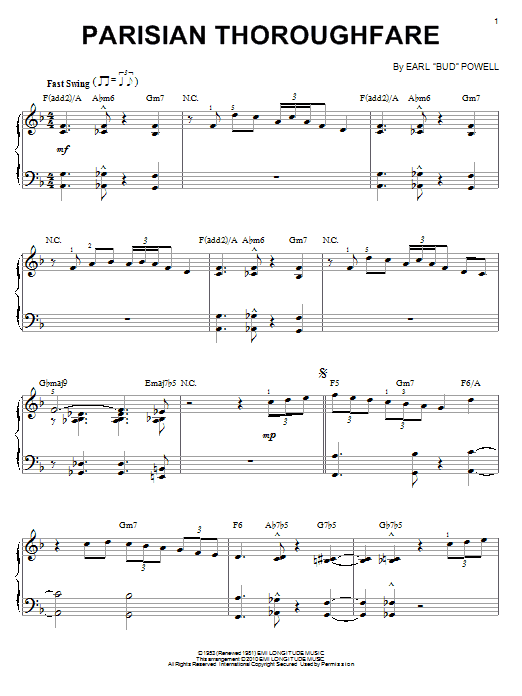 Download or print Bud Powell Parisian Thoroughfare sheet music, chords and digital score arranged for Real Book – Melody & Chords – Bass Clef Instruments. This Jazz score includes 1 page(s).