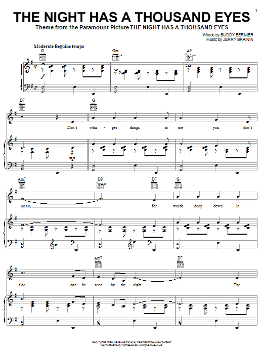 Download or print Buddy Bernier The Night Has A Thousand Eyes sheet music, chords and digital score arranged for Piano, Vocal & Guitar Chords (Right-Hand Melody). This Country score includes 4 page(s).